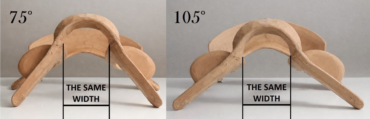The system offers a very wide adjustment range from 75° to 105°, allowing the saddle to be fitted to most types of horses — from massive cold-blooded ones to very narrow Arabians. Adjustment is made through smooth rotations using a single key inserted from the top. Adjustments can even be made while sitting on the horse, without removing the saddle.