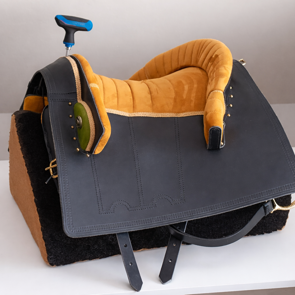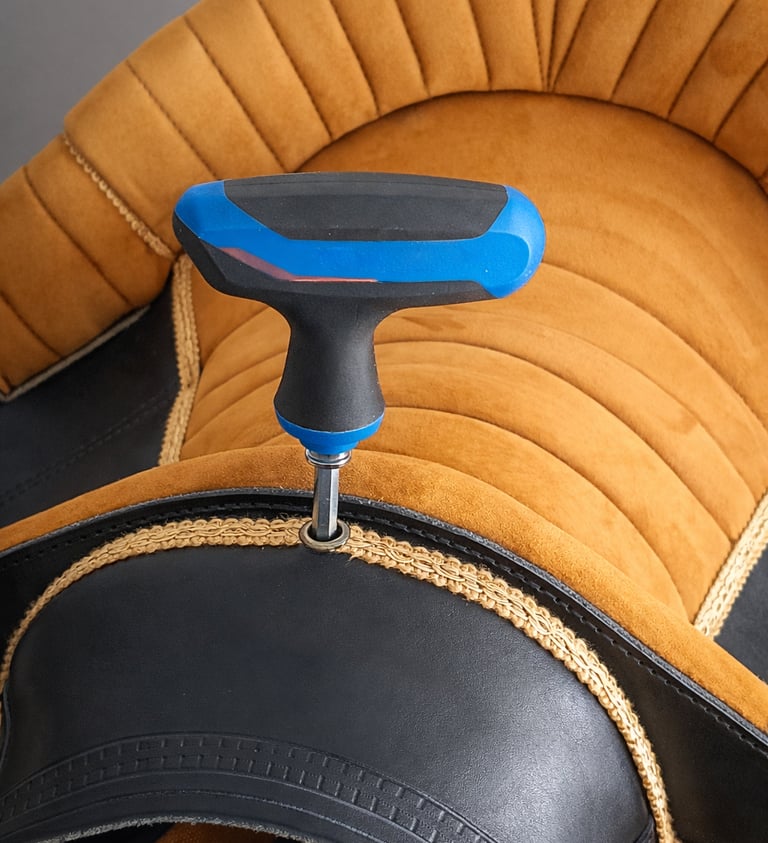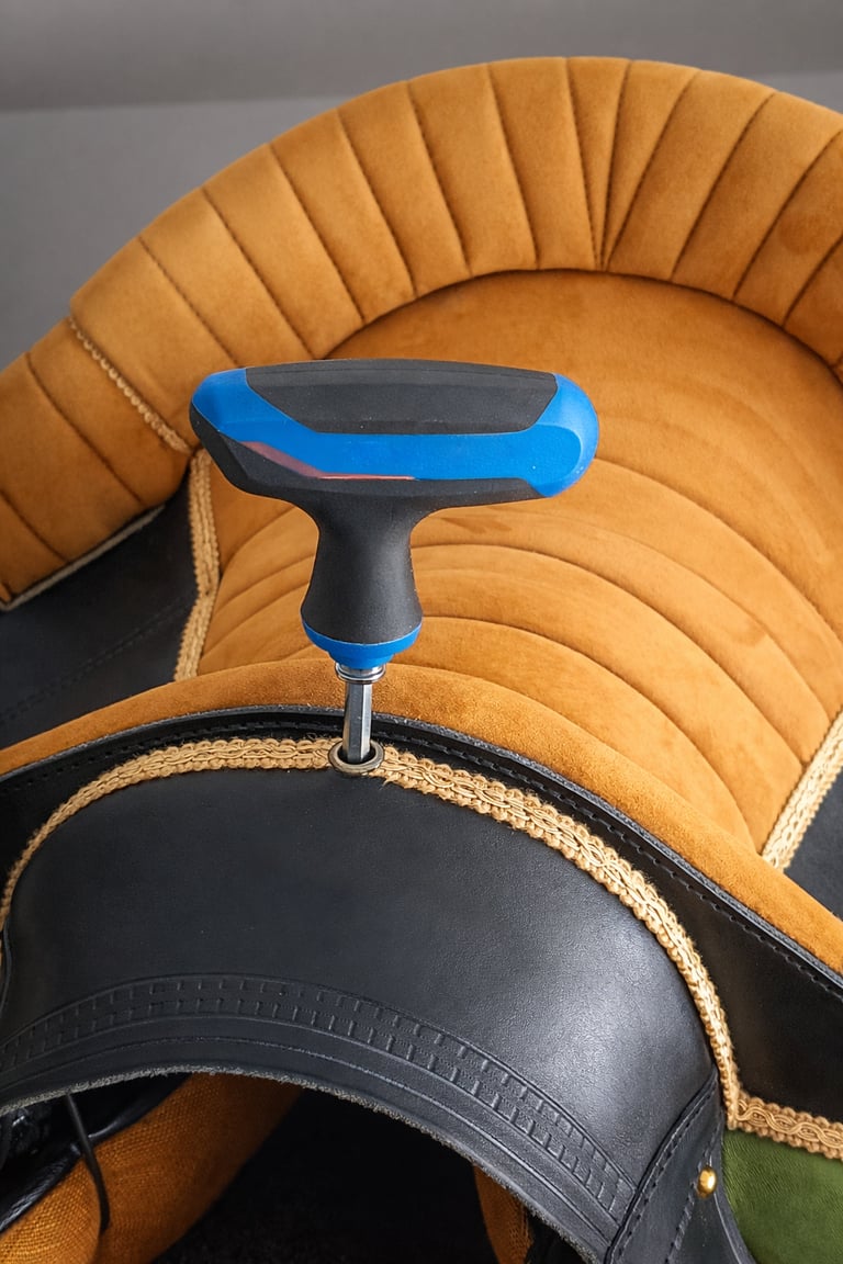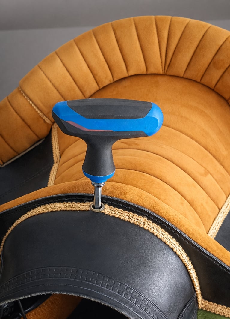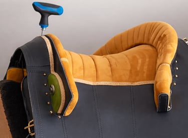 Do not use too much force or electric tools- it may damage the mechanism. During addjustment do not press the front of the saddle. If adjusting on the horse lean back a little to release the pressure from the front part of the saddle. The top-mounted mechanism is self-locking, which reduces the risk of accidental angle change during work with the horse.