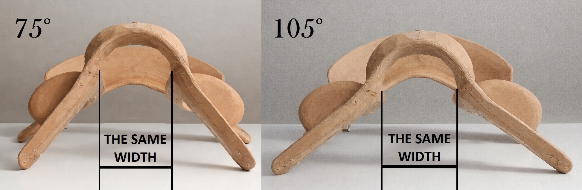 The Adjustment Saddle System allows to set the front arch angle from 75° to 105°, which makes it possible to fit the saddle to a very wide range of back conformations — from very flat backs (e.g., cold-blood horses) to very narrow and steep backs (e.g., Arabian horses). The adjustment is smooth, allowing precise fitting to different horses as well as to a horse’s changing physique (for example during muscle development, seasonal changes or aging).