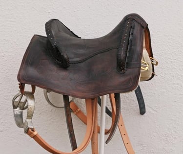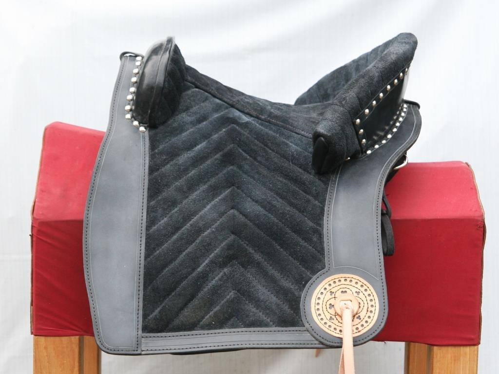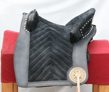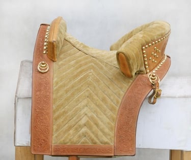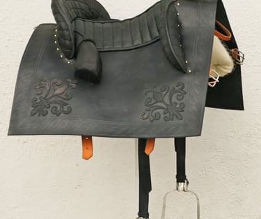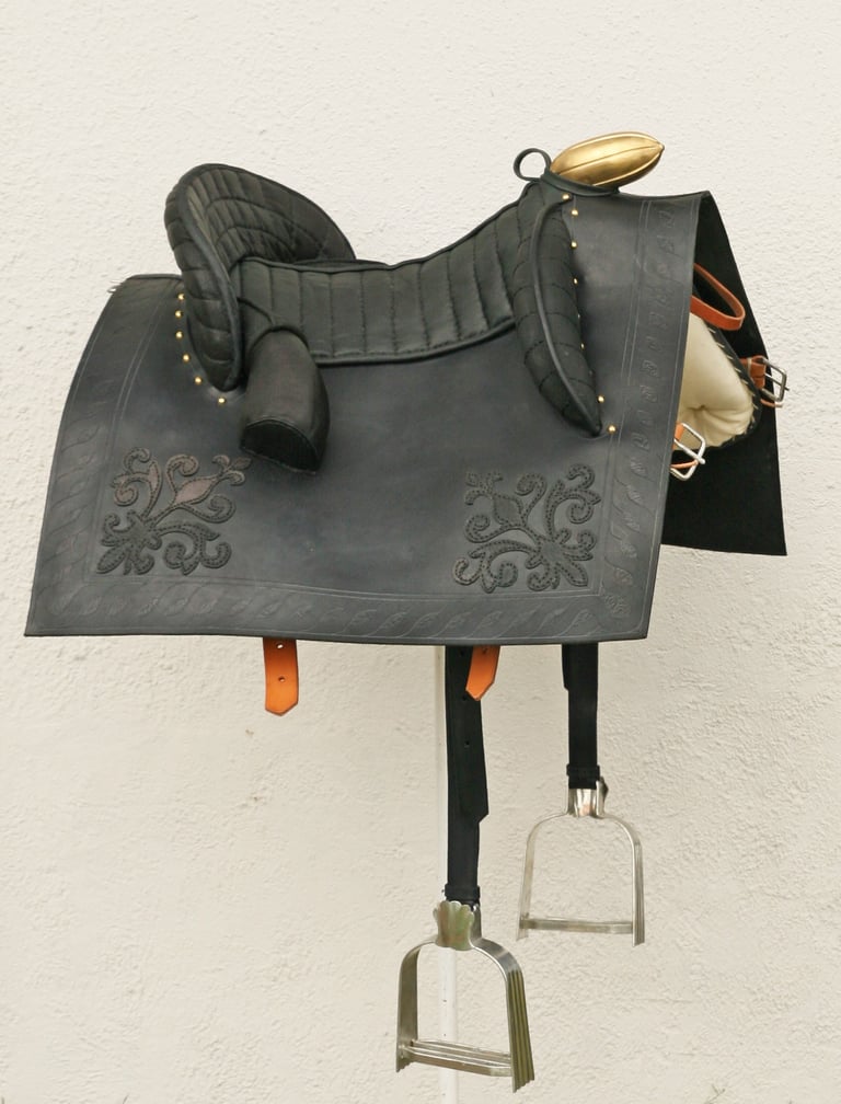 Iberian type saddle with intricate decorations and metal fittings. The seat cover finished with soft suede leather.