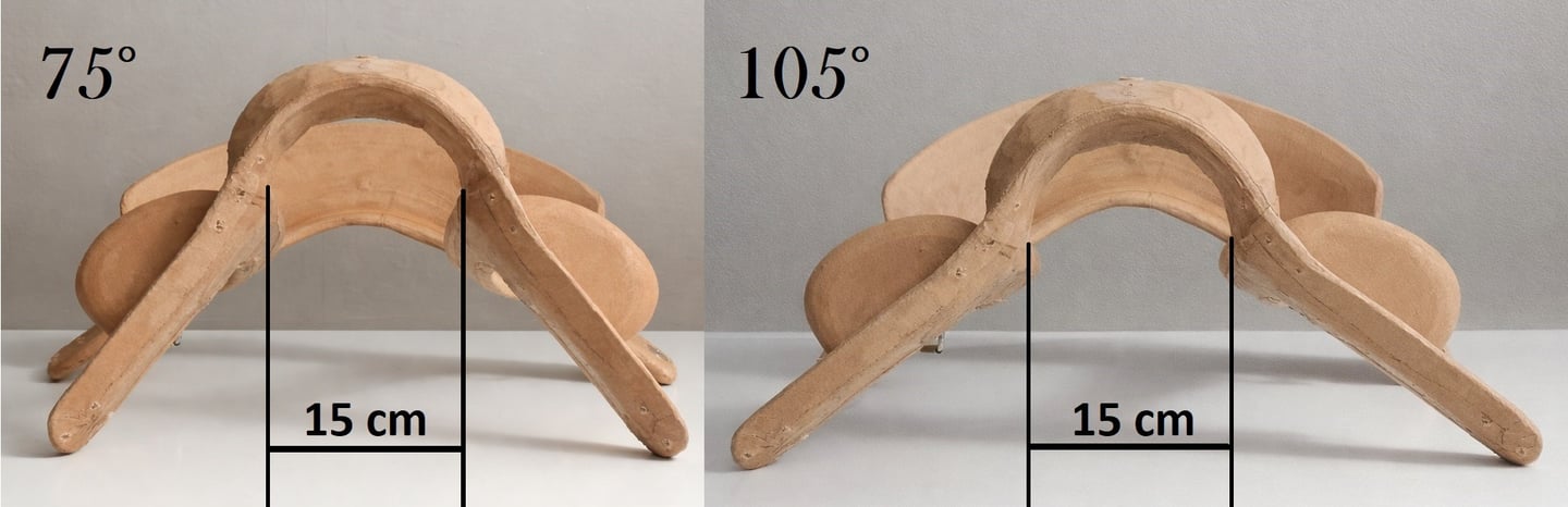 The system offers a very wide adjustment range from 75° to 105°, allowing the saddle to be fitted to most types of horses — from massive cold-blooded ones to very narrow Arabians. Adjustment is made through smooth rotations using a single key inserted from the top. Adjustments can even be made while sitting on the horse, without removing the saddle.