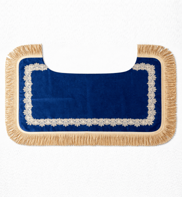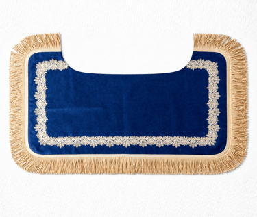 Made from velvet on the outside — decorated with gold lace and fringes. Attached to the saddle with leather ties. Other colours available.