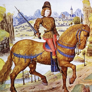 Based on illumination by the Boucicaut Master, in Boccaccio, 'Des cas des nobles hommes et femmes, trans'. French, Paris, about 1415.