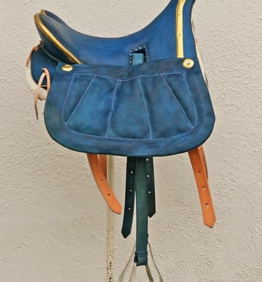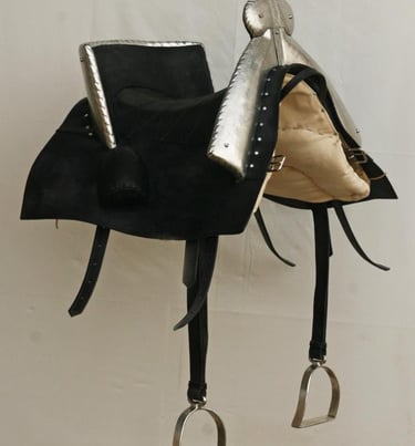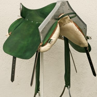 These are saddles intended for jousting discipline or mounted combat and they are reconstructed on the basis of the preserved originals. The saddle tree is made of wood and has long and wide sticking out points that encompass the horse and prevent the saddle from twisting on its back. Moreover, these parts distribute the weight of the rider properly. On the bottom of the saddle tree there are pillows filled with natural wool that adapt to the horse's back. Depending on your preferences the seat can be hard or with a layer of felt. In these models the pommels are covered with metal plates of iron or brass.