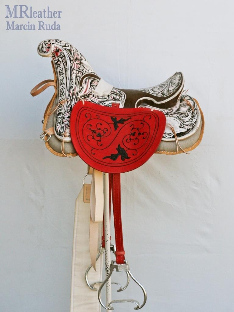 Based on the bone saddle from London (Royal Armouries) 1400-1430, inv. VI.95. 'Possibly for the Hungarian Dragon Order'. The saddle tree made by Joram van Essen. Instead carved bones saddle was painted by Markéta Poskočilová. My part of work was added every leather elements.