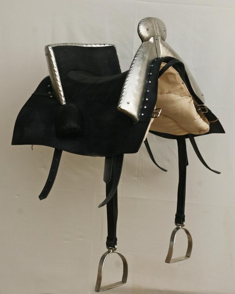 It is a type of saddle well described by 15th century authors such as Dom Duarte and Pietro Monte's Collectanea. The type designed for combat and tournaments, enabling the adoption of various types of seat and protecting the lower parts of the rider. The saddle is built on wide bars, which are designed to distribute the weight of the rider. On the bars there is a cushion filled with straw or fur. Such saddles do not impose a precise seat, but due to the height of the cushion and its narrow profile, they provide a very comfortable position in the 'standing' style with the legs straight down. Thanks to the extended pommel, the saddle allows you to brace yourself well and feel safe.